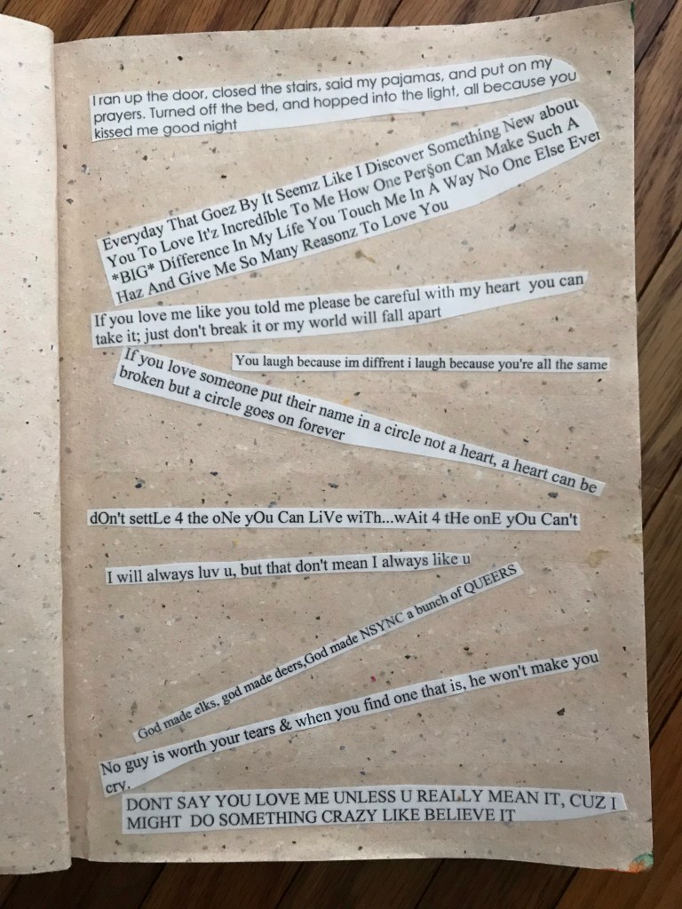 I don’t recall ever really thinking of myself as a writer or even a reader prior to middle school. During that time, I began to see text as something I could use to relate my experiences to. I started collecting quotes from a website that had several themed lists of quotes and would search for quotes that I could relate to. The theme I recall searching for most often was, of course, love. Because what tween girl doesn’t have some interest or experience with love? For Christmas one year, I was given a book of colored, recycled construction paper and decided I would use it to collect quotes that I related to. I divided the colored sections into quotes that related to different parts of my life. I still have that book today. It was the first of many collections I’ve created since.