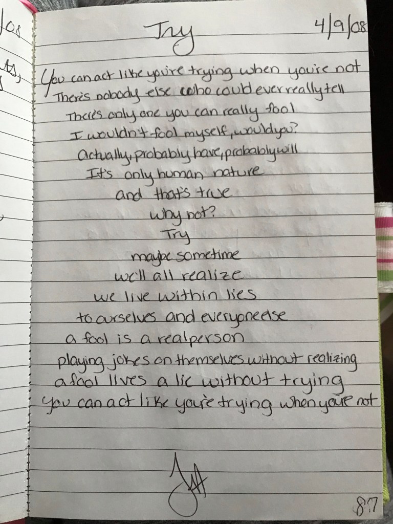 I did, however, write for pleasure outside of school beginning in my freshmen year. When the hormonal teenage angst took hold of me, I found writing to be an escape and relief. I remember writing notes and folding them up into small triangles and passing them on to friends between classes. I even recall creating a code with one friend so that nobody else could read what we wrote. And I wrote poetry. A lot of poetry. When I wrote poetry, I left the world of traditional literacy that I had learned about in school, or so I thought. I imposed no rules upon myself and wrote freely. I would spend hours trying to find the words that sounded just right. I would make lists of words that rhymed, and themes to write about. Once I had accumulated a sizable collection, I began transferring my work into a single book that I still have today.