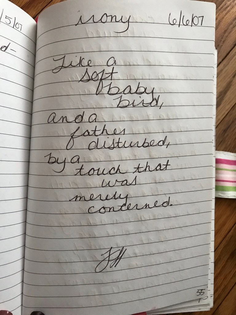 In my sophomore year of high school, I had an opportunity to take a class on poetry. I was placed in a class full of apathetic students who saw it as an “easy A”. It was clear to me that most of my classmates thought the class was a joke. I enjoyed the class though and used all that I learned to experiment in writing poetry in new formats. I recall that teacher writing “Brilliant!” on one of my poems and that stuck with me. I continued writing poetry all throughout high school.